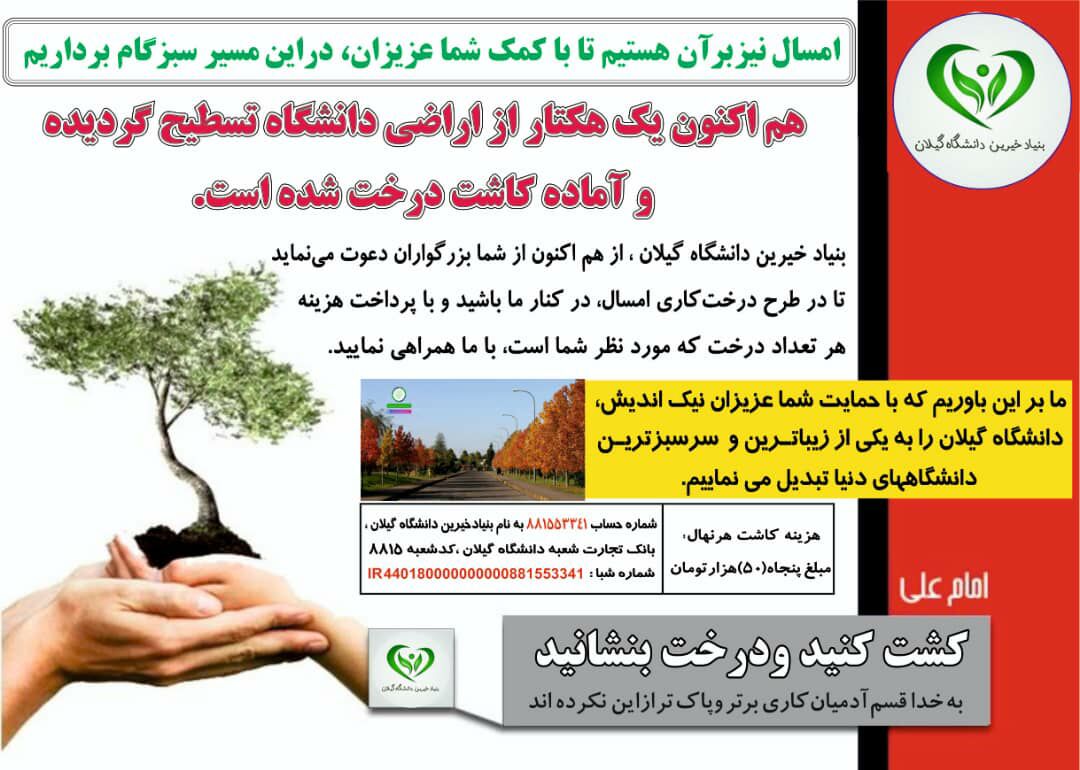 بنیاد خیرین دانشگاه گیلان از هم اکنون از شما بزرگواران دعوت می نماید تا همانند سالهای گذشته، در طرح درختکاری امسال نیز، در کنار ما باشید و با پرداخت هزینه هر تعداد درخت مورد نظر شما ، ما را در این طرح همراهی نمایید .
